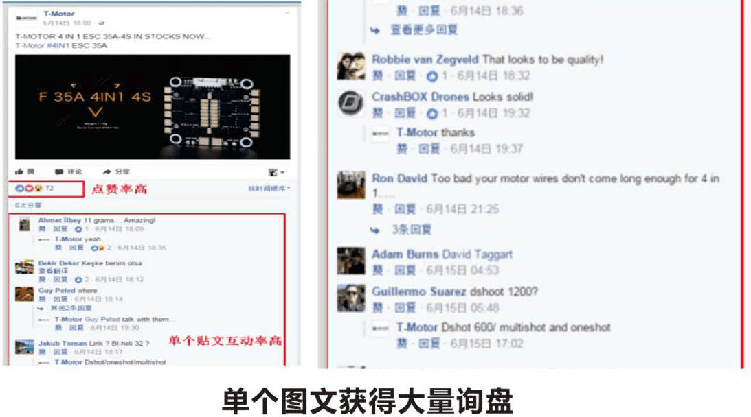 高級策劃顧問與T-motor溝通公司的品牌和產品定位,精選四個品牌產品關鍵詞;結合Facebook等社交媒體對用戶及用戶人群的定位,選取符合關鍵詞定位的上中游用戶群推廣T-motor,向真正對 T-motor的產品感興趣的意向客戶或關聯客戶精準曝光T-motor的品牌、產品及金牌工廠旗艦店。