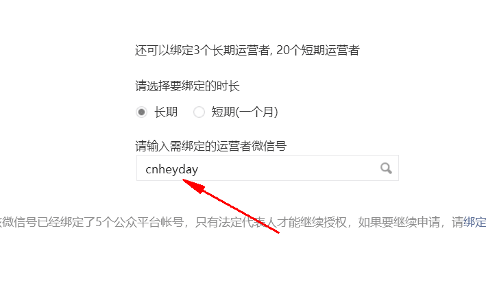 6.綁定的時長,選擇長期. 輸入需要綁定的運(yùn)營者微信號(有2個號需要綁定): cnheyday(盛世傳媒陳經(jīng)理號) sscmwlyyh(盛世傳媒運(yùn)營號)
