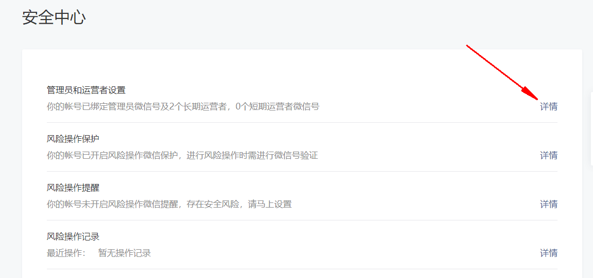 4.右側(cè)出現(xiàn)安全中心相應(yīng)內(nèi)容,選擇管理員和運(yùn)營者設(shè)置,點(diǎn)擊右側(cè)詳情