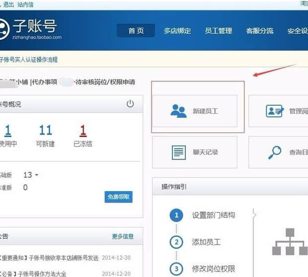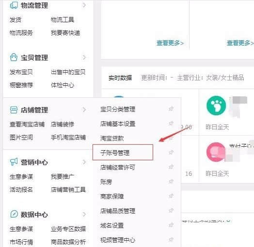 - 進入店鋪后臺,選擇店鋪管理菜單欄;子賬號管理設置